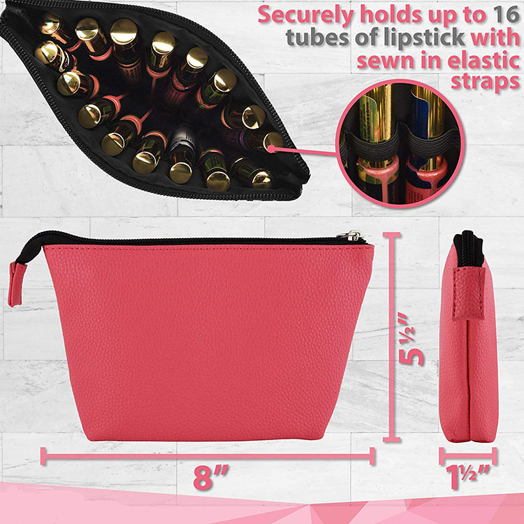* This simple, classic design keeps up to 16 tubes of lipstick securely in place with individual elastic bands